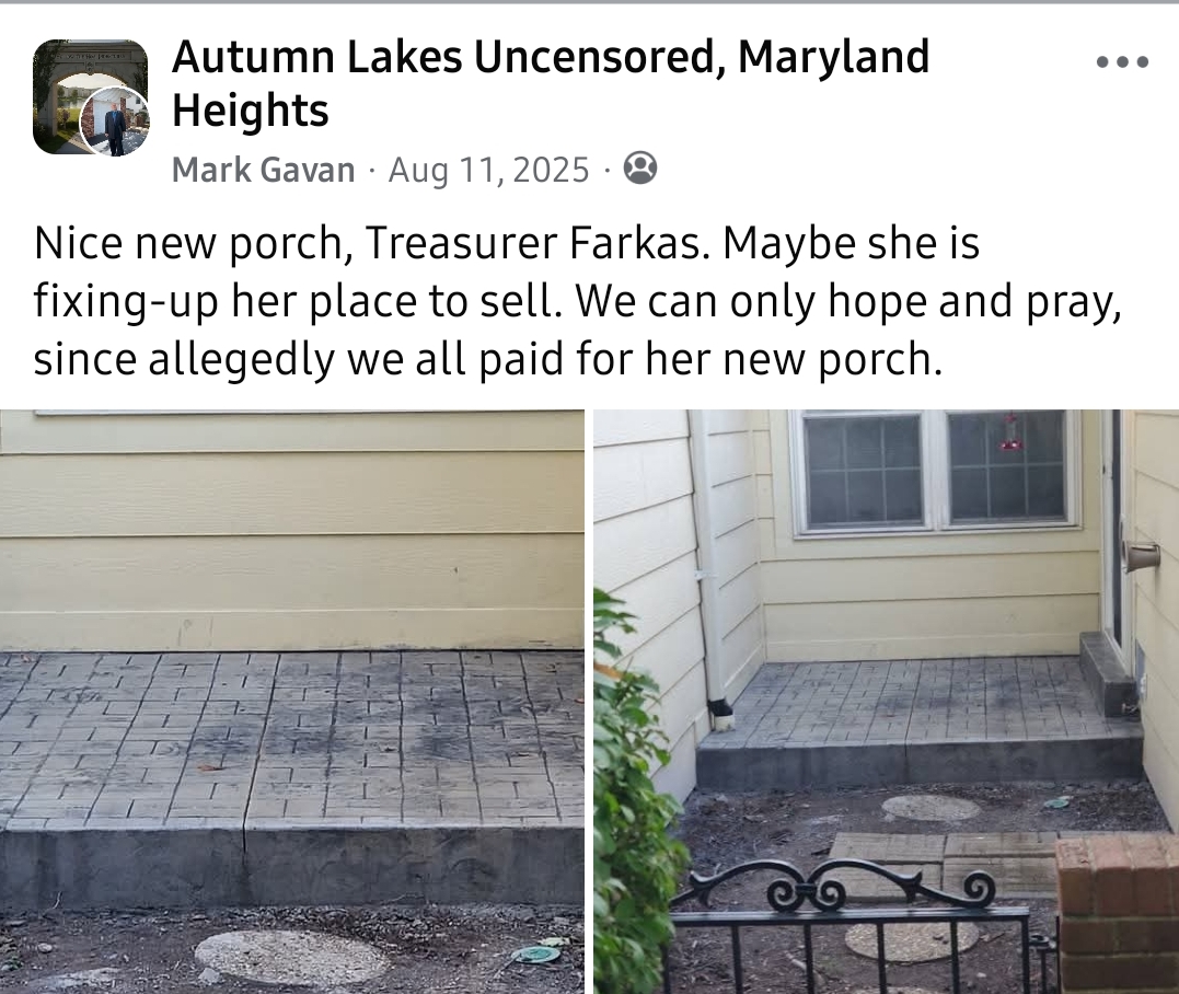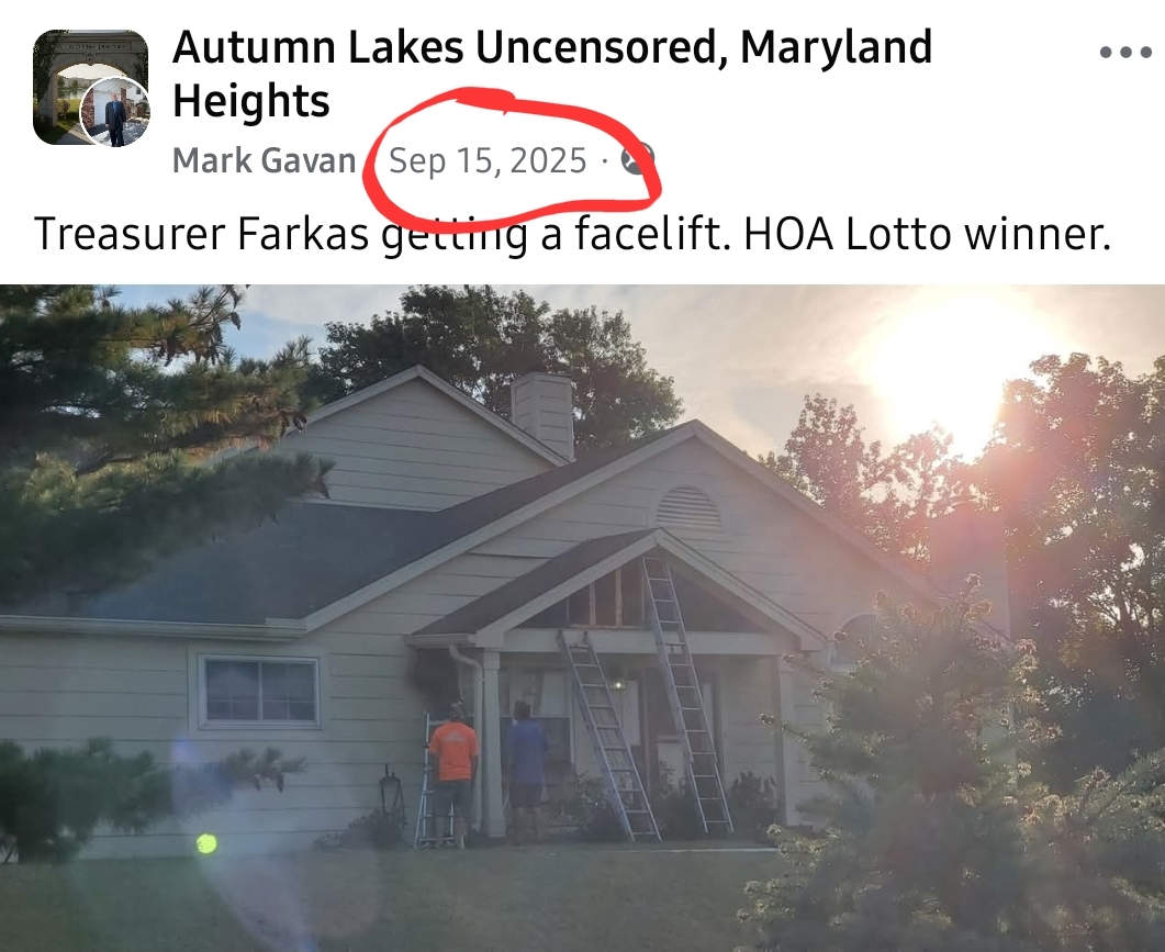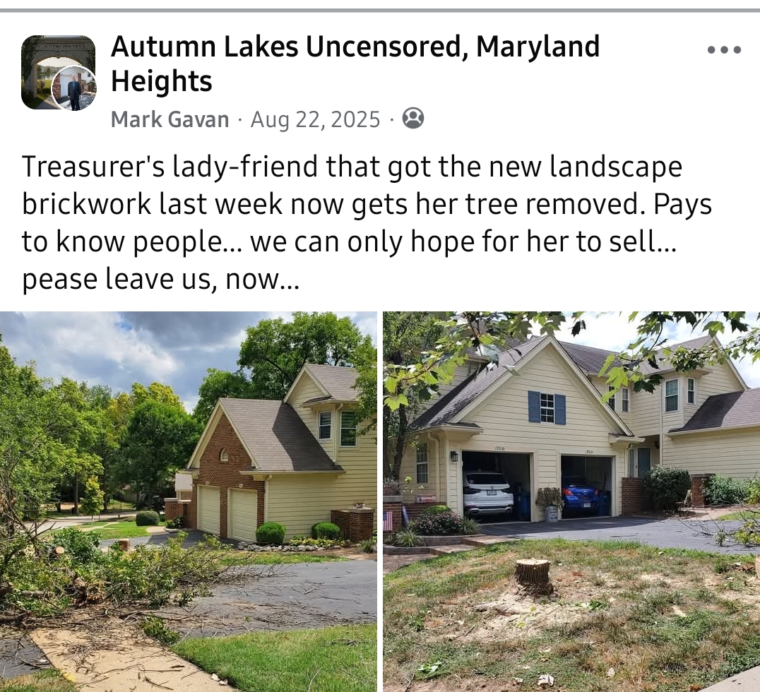 I just drove through Autumn Lakes to see my house from the back side. I saw the banners on the suv near the front and snapped a photo to come take a look.I am one of the residences that just had the long-standing (often not-standing) privacy fence removed from our backyard. When I enquired about repairing their fence, they said they had no plans to repair the fence. Then out of the blue on a Friday morning they chopped it all down. Not a warning or explanation. Now our back yard is fully exposed. Its not the house we bought. Its not the neighborly friendly heads up or simple communication that seams like a reasonable courtesy.They sent a letter generally saying \"we have no legal obligation or plans to repair the fence. If you have people walking through your back yard call the police.\"After Googling a possible legal precedent for the situation in Maryland Heights, I got the exact ChatGPT response as was in the Autumn Lakes letter. Nearly copied and pasted.My uncle lived in a condo for many years there. He had full inside of how the operation was run; Poorly. When he passed away, his kids had to handle the legal hurdles just to sell the condo. It took them months just to cut through the BS.As I understand it, there have been 2 firms managing Autumn Lakes in the 9 years I\'ve lived adjoining it, and the 2nd one just blames the 1st for any lingering crap.I don\'t know who this reaches, or if I will even be taken into account on your wonderful, and quite confirming of my feelings, page here... but these people don\'t give a shit about my position. I could only imagine being under their \'management\' in a condo or home. I mostly want to know if this fence is being replaced, or did they just leave us with our back yard pants pulled down. To whom it may concern, thank you for any reply.