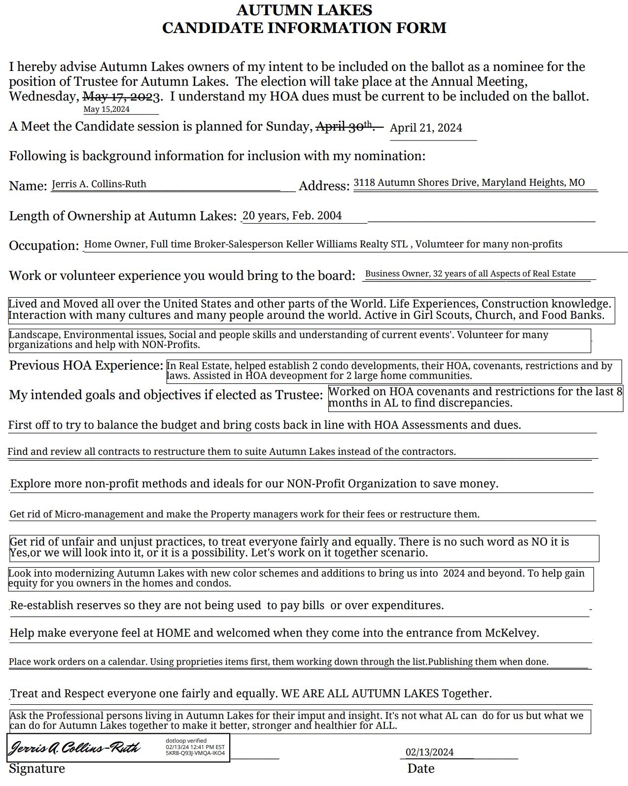 I am very pleased that today Jerris Collins-Ruth submitted her Candidate Information Form to officially become a candidate for our HOA Board election in May. The link to her form can be found below.